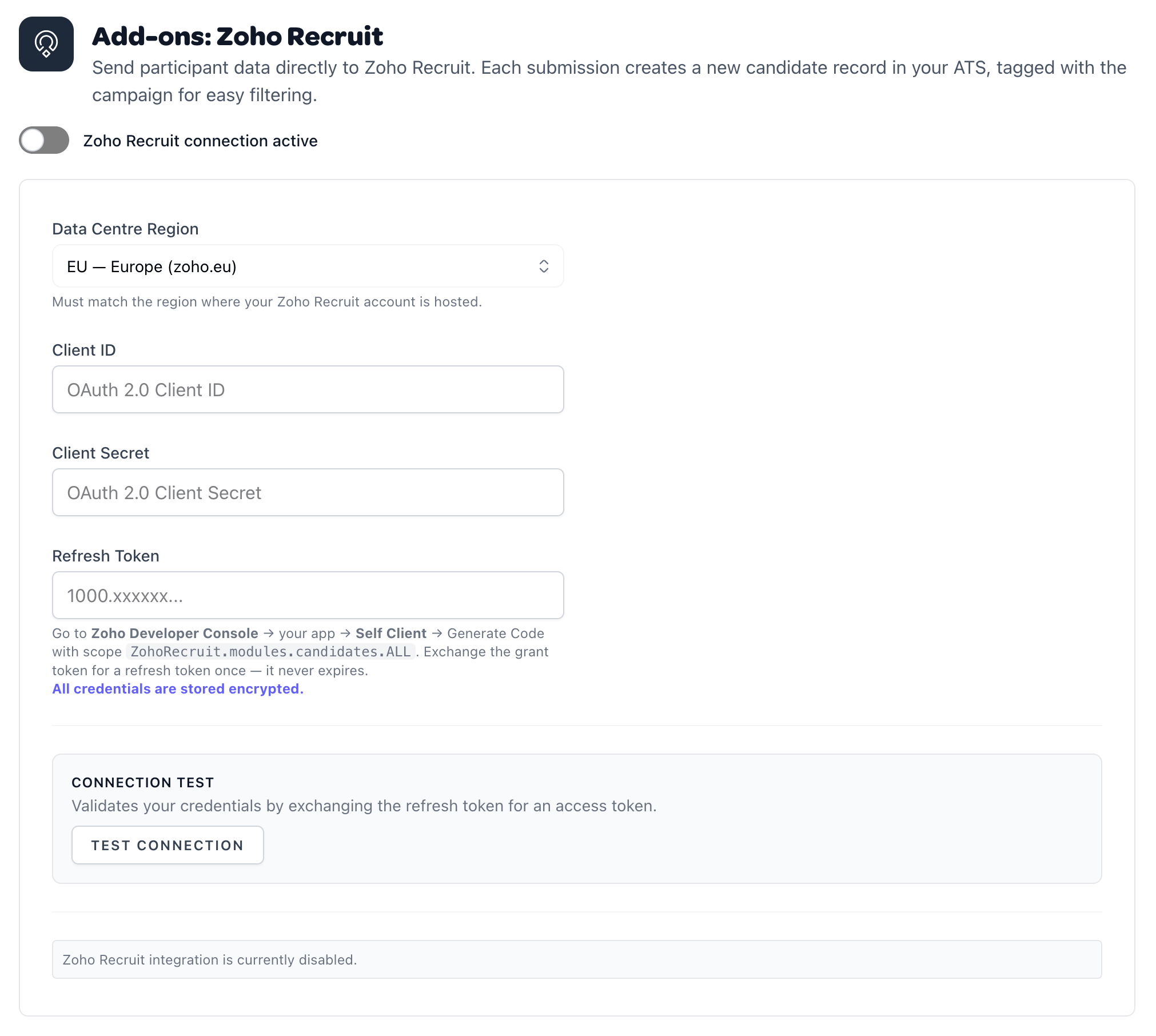 With Refybe, organizations can embed gamified campaigns directly into Zoho Recruit career portals. Candidates can participate in branded games, complete knowledge or values quizzes and engage with content that communicates company culture before they apply.